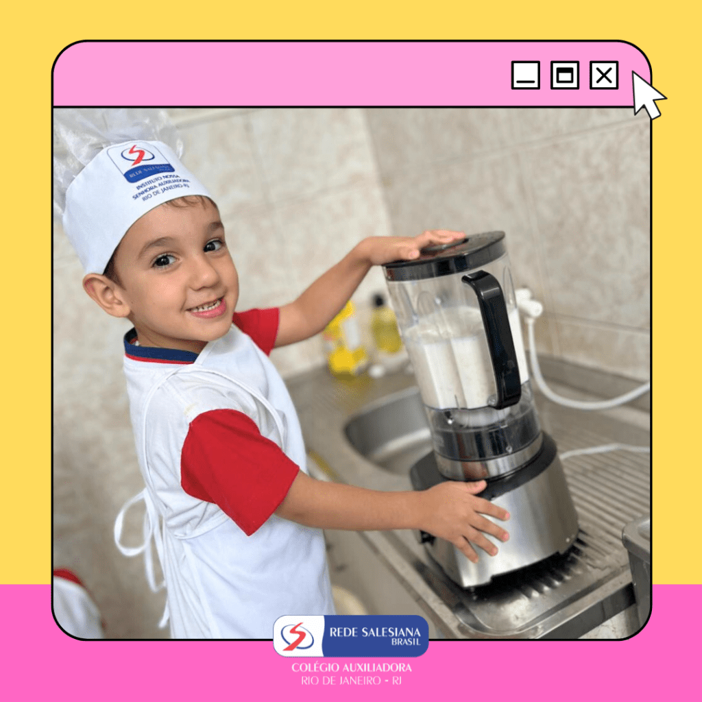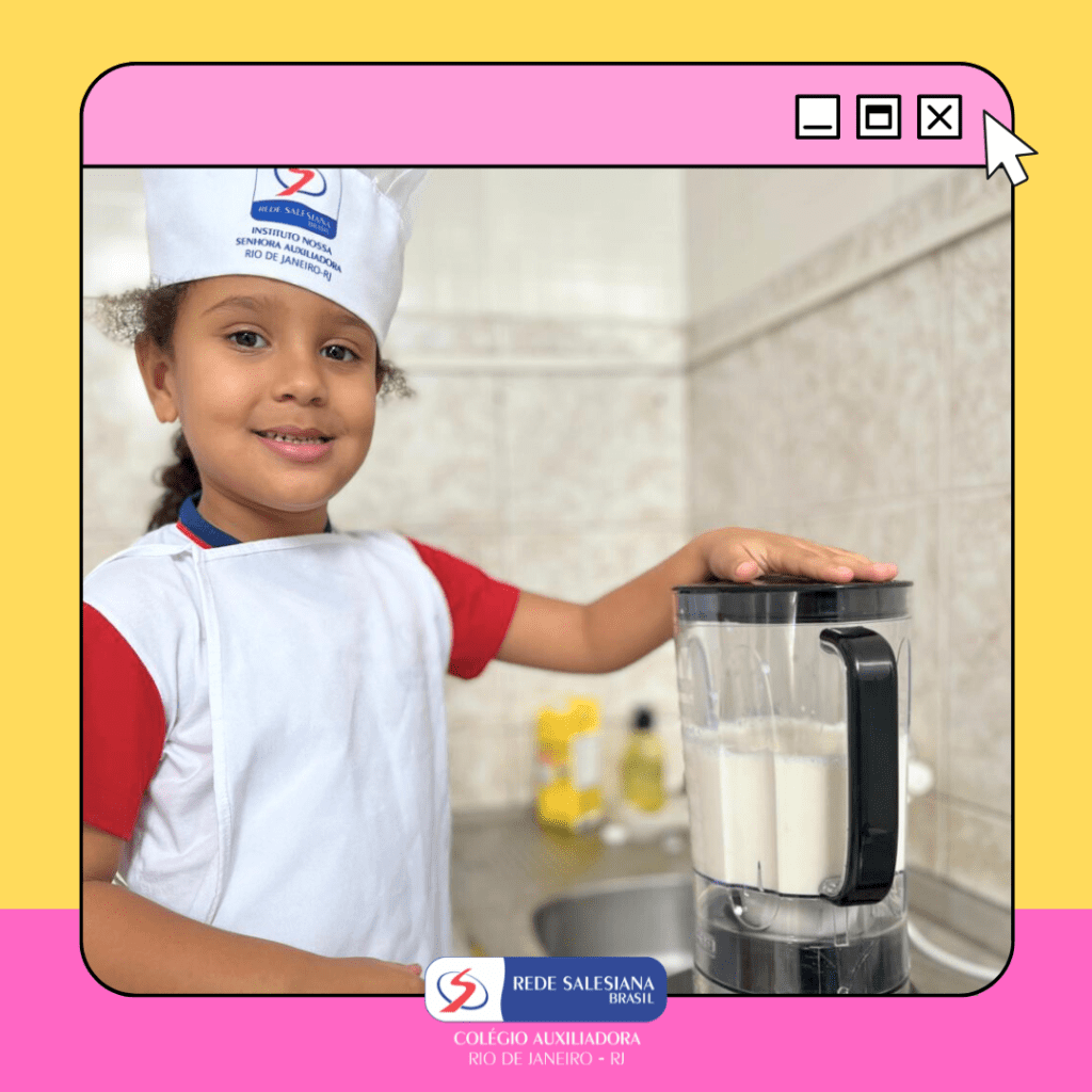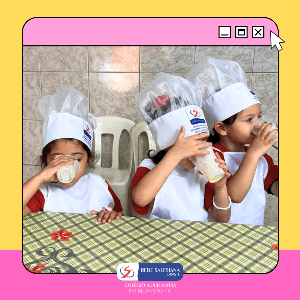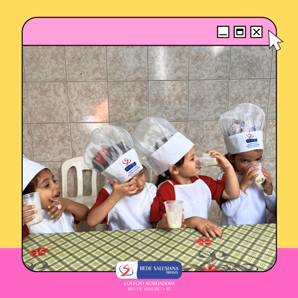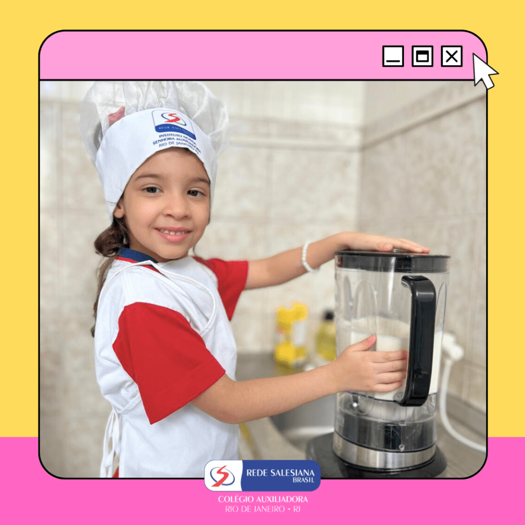 A Pré-Escola 1 viveu uma experiência nutritiva e cheia de afeto com a proposta do 3º giro do livro Girolhar: Quitanda de Histórias. As crianças escolheram bananas e maçãs para preparar uma deliciosa vitamina, explorando cores, sabores, texturas e aprendendo, na prática, sobre hábitos saudáveis. Essa vivência fortalece o vínculo com a alimentação consciente, estimula a autonomia, o trabalho em equipe e amplia o repertório sensorial e cognitivo dos pequenos. Cuidar do corpo também é brincar de aprender! ✨ Cuidar da infância é alimentar o futuro!
