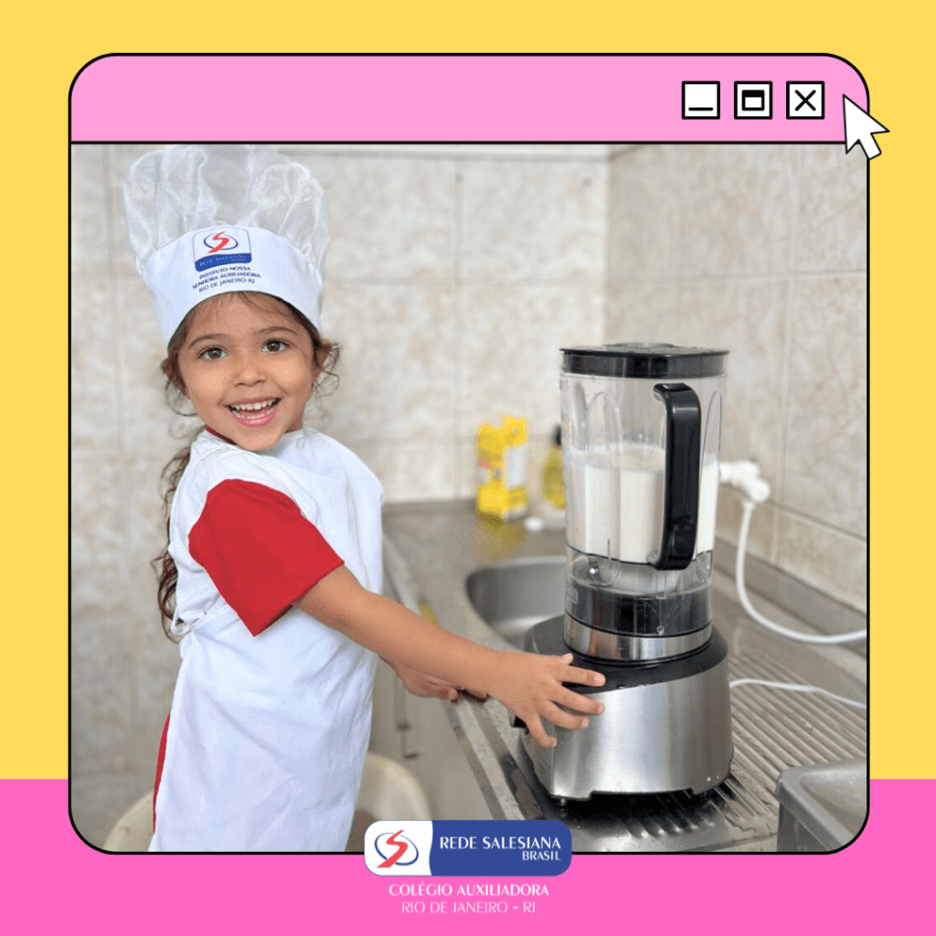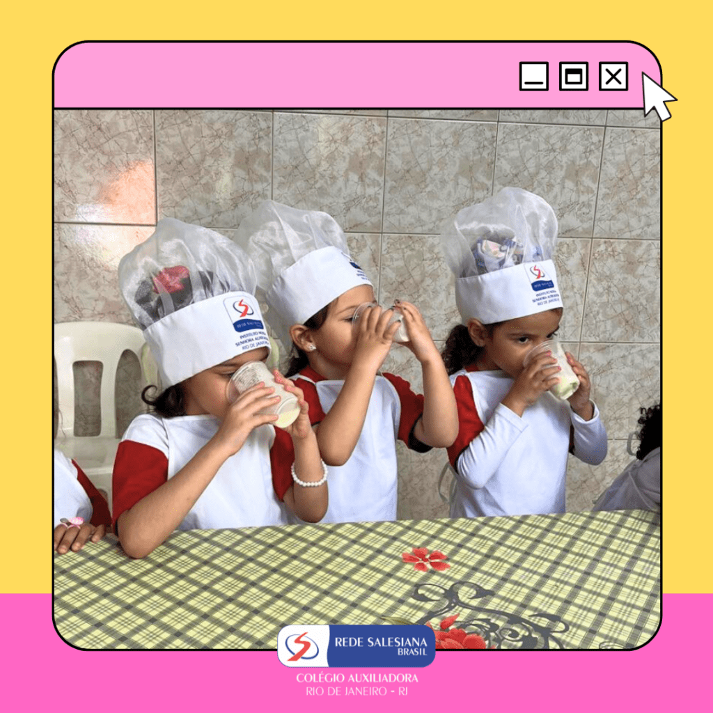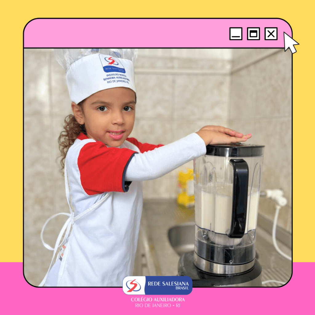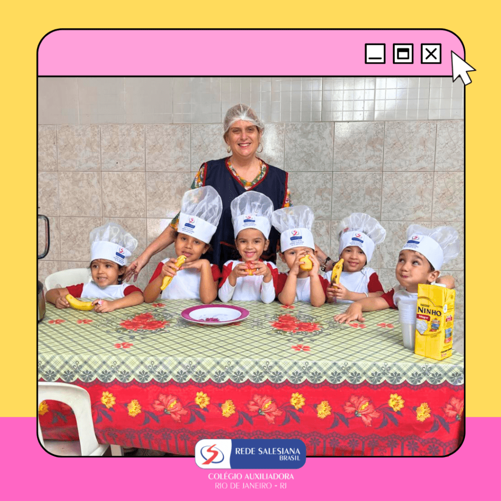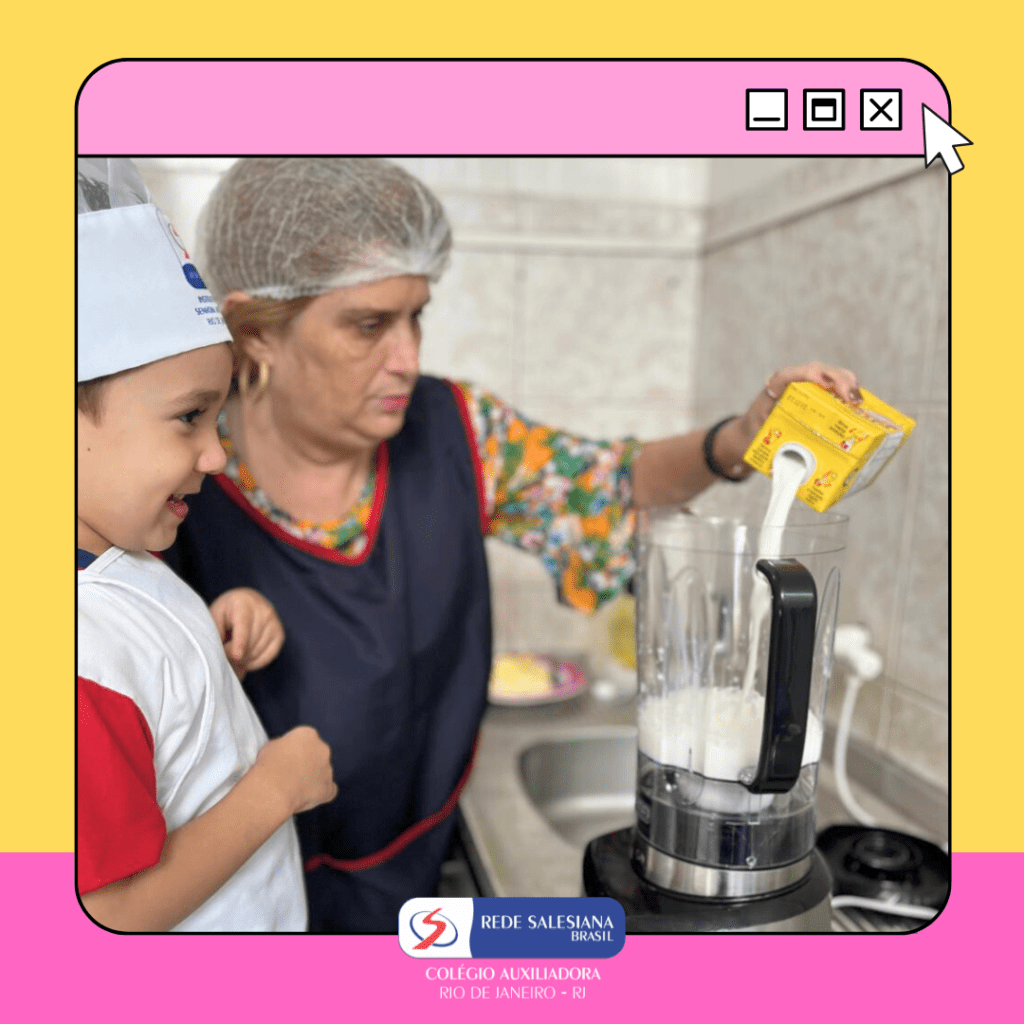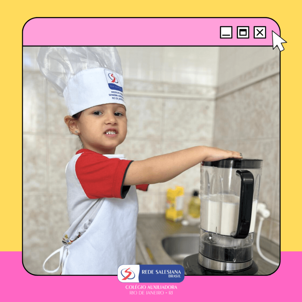 A Pré-Escola 1 viveu uma experiência nutritiva e cheia de afeto com a proposta do 3º giro do livro Girolhar: Quitanda de Histórias. As crianças escolheram bananas e maçãs para preparar uma deliciosa vitamina, explorando cores, sabores, texturas e aprendendo, na prática, sobre hábitos saudáveis. Essa vivência fortalece o vínculo com a alimentação consciente, estimula a autonomia, o trabalho em equipe e amplia o repertório sensorial e cognitivo dos pequenos. Cuidar do corpo também é brincar de aprender! ✨ Cuidar da infância é alimentar o futuro!