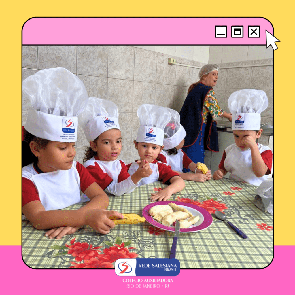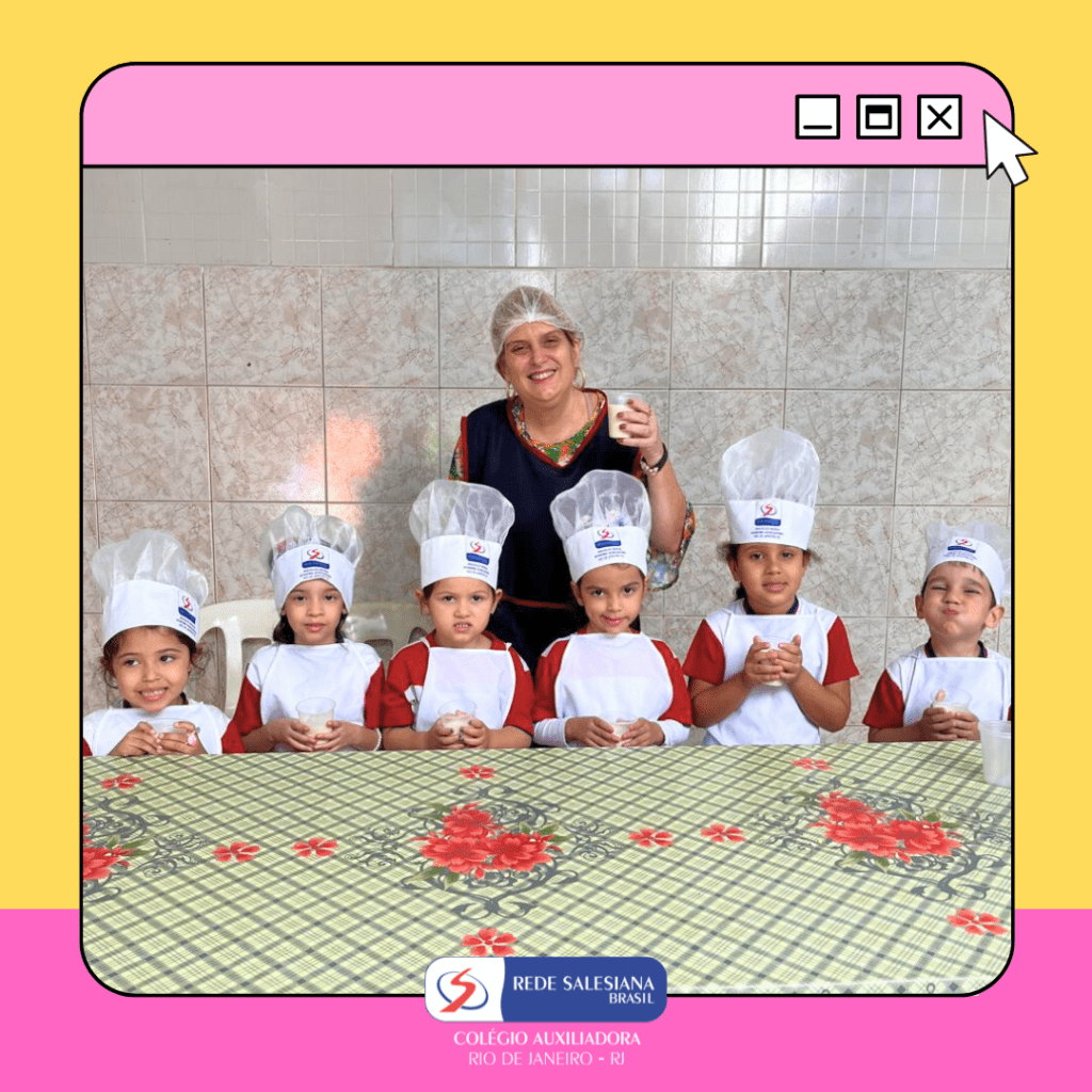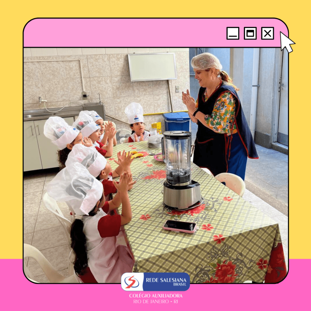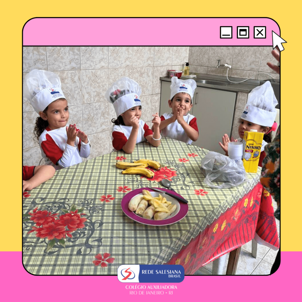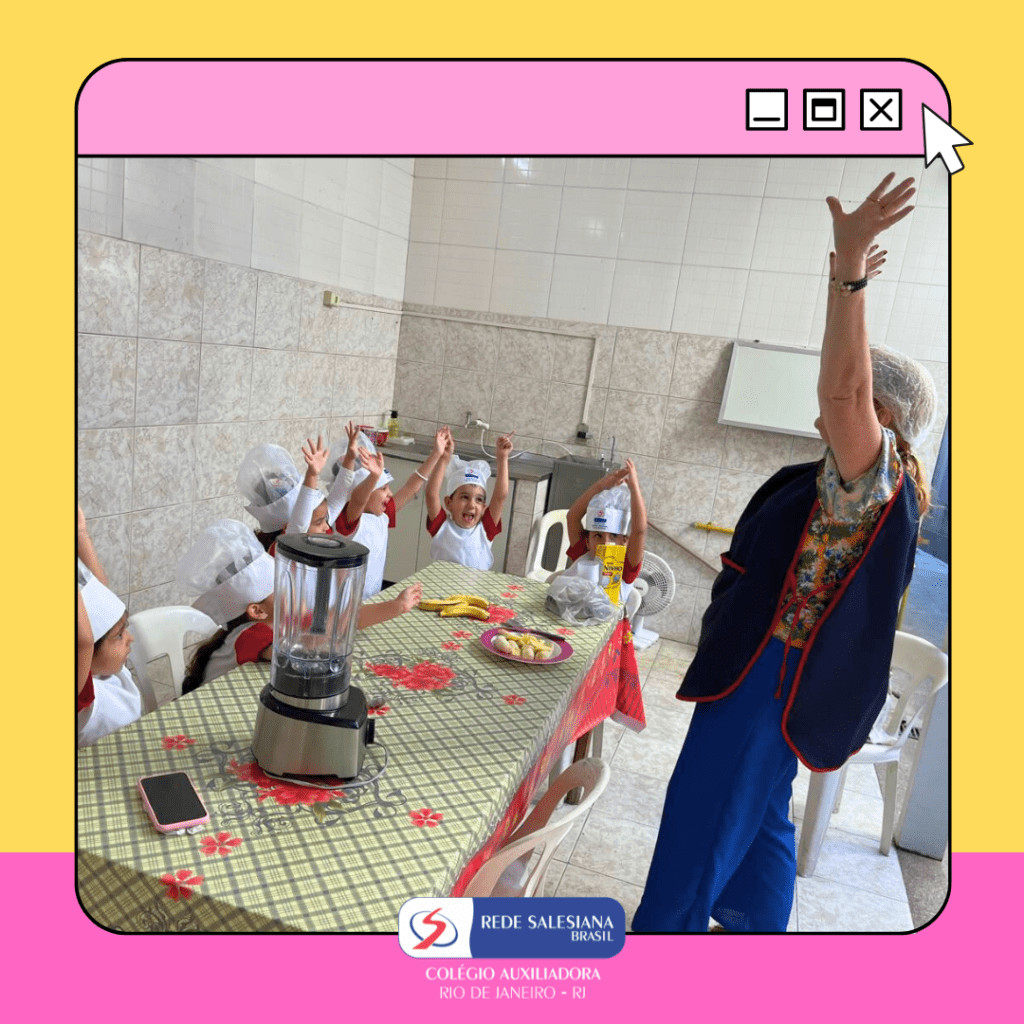 A Pré-Escola 1 viveu uma experiência nutritiva e cheia de afeto com a proposta do 3º giro do livro Girolhar: Quitanda de Histórias. As crianças escolheram bananas e maçãs para preparar uma deliciosa vitamina, explorando cores, sabores, texturas e aprendendo, na prática, sobre hábitos saudáveis. Essa vivência fortalece o vínculo com a alimentação consciente, estimula a autonomia, o trabalho em equipe e amplia o repertório sensorial e cognitivo dos pequenos. Cuidar do corpo também é brincar de aprender! ✨ Cuidar da infância é alimentar o futuro!